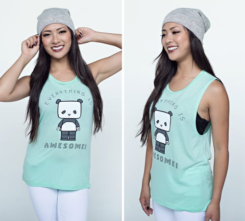 "Lego Panda" design printed on a feminine, low-sleeve mint muscle tank.