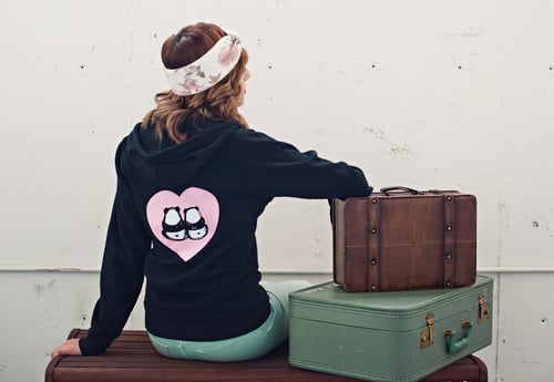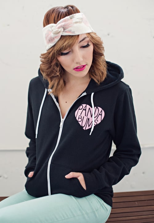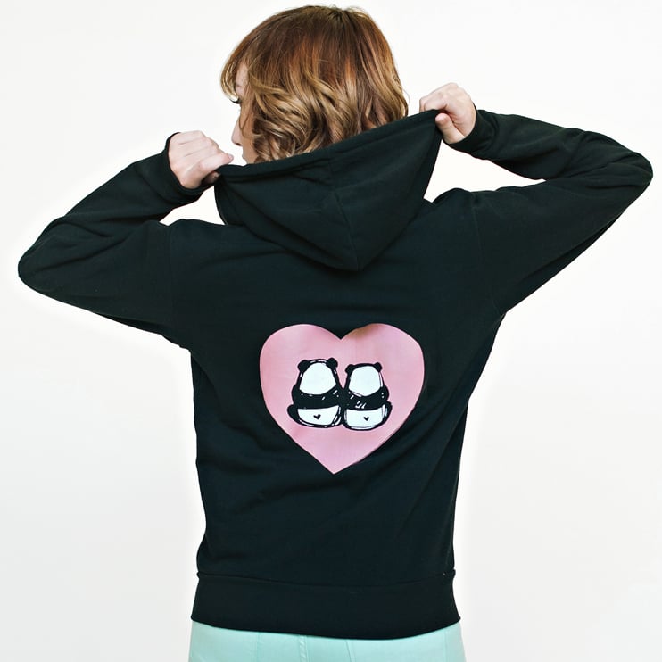"Panda Bums in Love" design printed on the back of black zipper hoodie jacket with a pink "Panda Bums" heart print on the front.