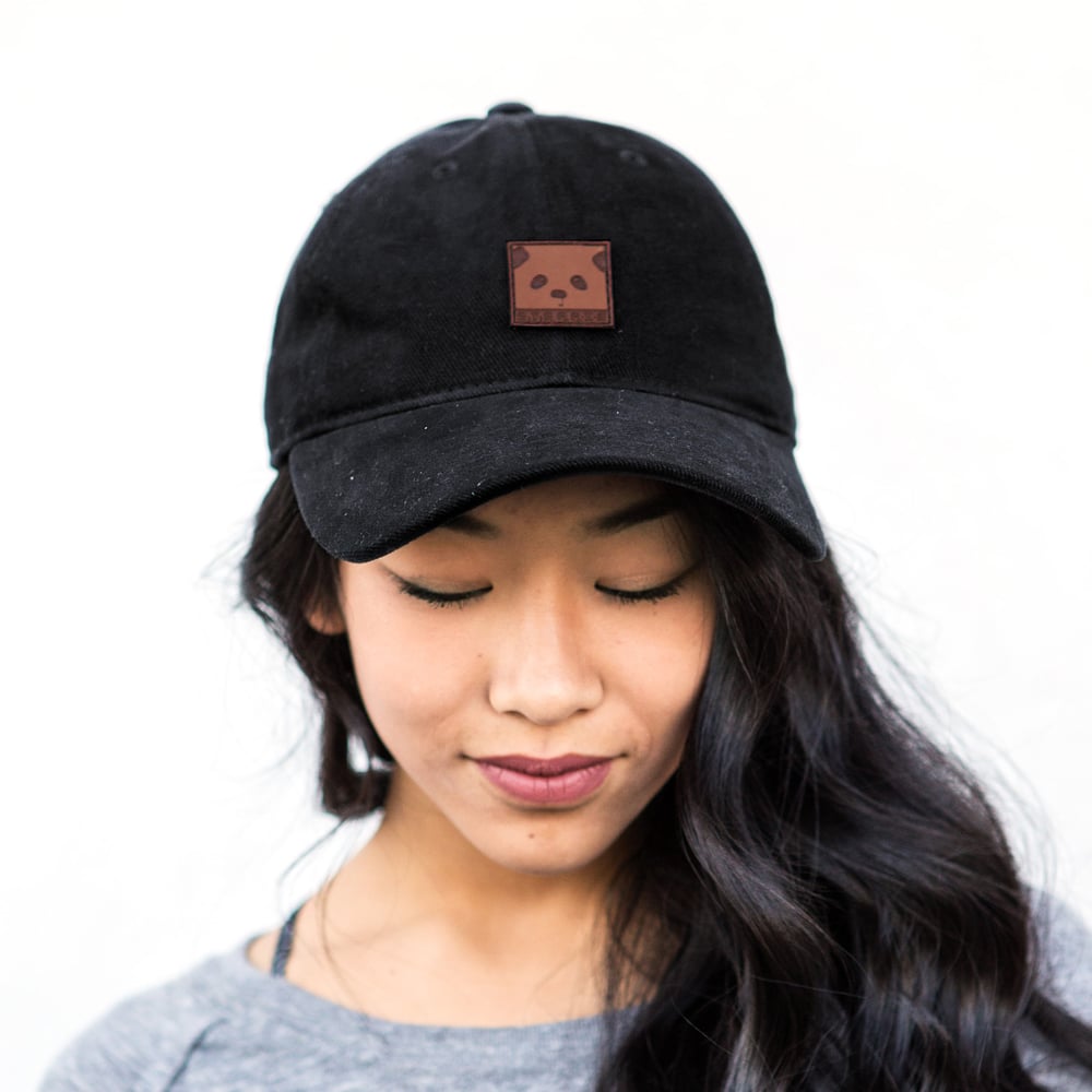 Laser engraved leather patches with our classic Panda Face logo on a 6-panel, unconstructed vintage washed cotton hat with a low crown and an antique brass buckle closure.